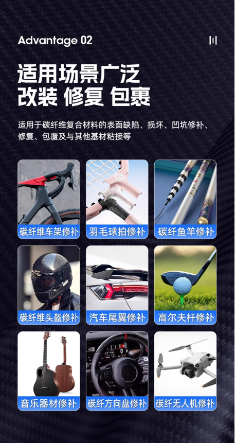 碳纖維復合材料粘接:作為膠,它能提供、高韌性的粘接效果,適用于碳纖維材料的自粘或與其他材料的互粘。12