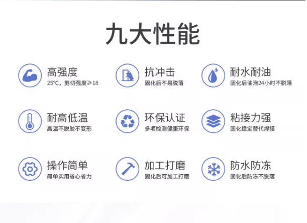 3.物理性能:粘度中等,固化后硬度高,適配金屬、鑄鐵等材料。